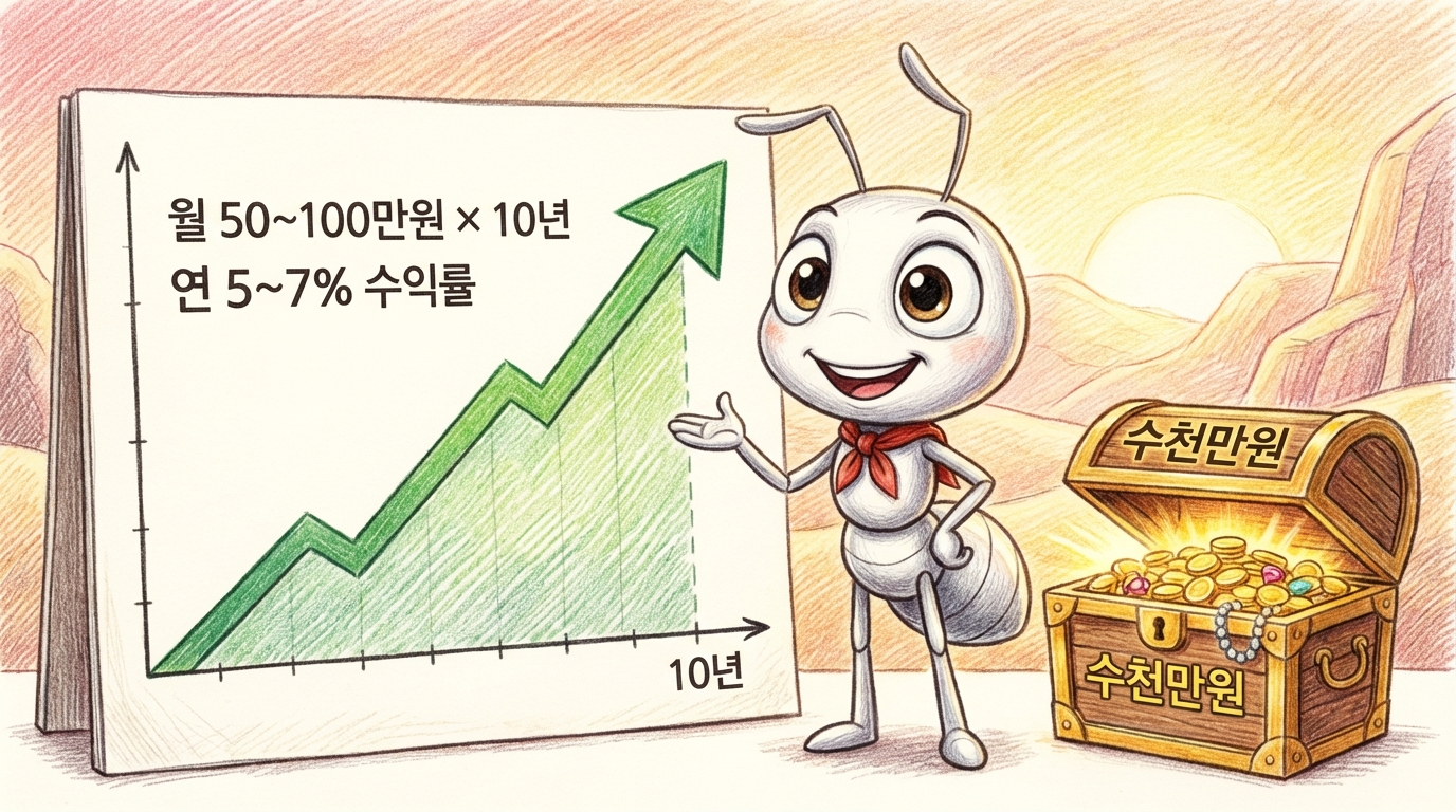 10년 뒤, 40살이 된 A와 B: 개미 A는 여전히 비슷한 회사 다니고, 통장에는 비상금 조금, 자동차 값 정도가 전부입니다. 주식은 겁나서 안 했거나, 한 번 했다가 물리고 손절하고 나와서 "역시 투자는 도박이야"라고 생각합니다. 반면 개미 B는, 매달 50만~100만 원씩 10년 동안 꾸준히 투자하면서, 수익이 좋든 나쁘든 계속 쌓아 올립니다. 연 5~7% 정도의 평균적인 수익률만 가정해도, 이때쯤이면 자산이 수천만 원 단위를 찍기 시작합니다.